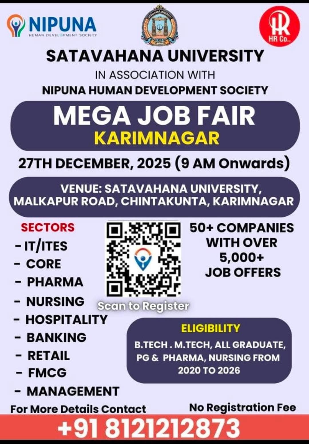 కరీంనగర్: శాతవాహన యూనివర్సిటీ, నిపుణ హ్యూమన్ డెవలప్మెంట్ సొసైటీ సహకారంతో మెగా జాబ్ ఫెయిర్ ను నిర్వహించనుంది. ఈ ఉద్యోగ మేళా డిసెంబర్ 27, 2025న ఉదయం 9 గంటల నుంచి ప్రారంభమవుతుంది.