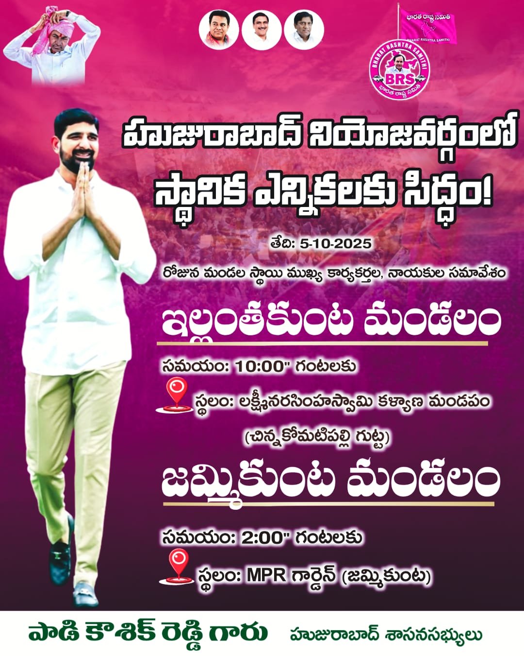 సమావేశాని కి BRS పార్టీ కార్యకర్తలు KCR అభిమానులు అందరూ పాల్గొనాలని హుజురాబాద్ శాసనసభ్యులు పాడి కౌశిక్ రెడ్డి పిలుపు.