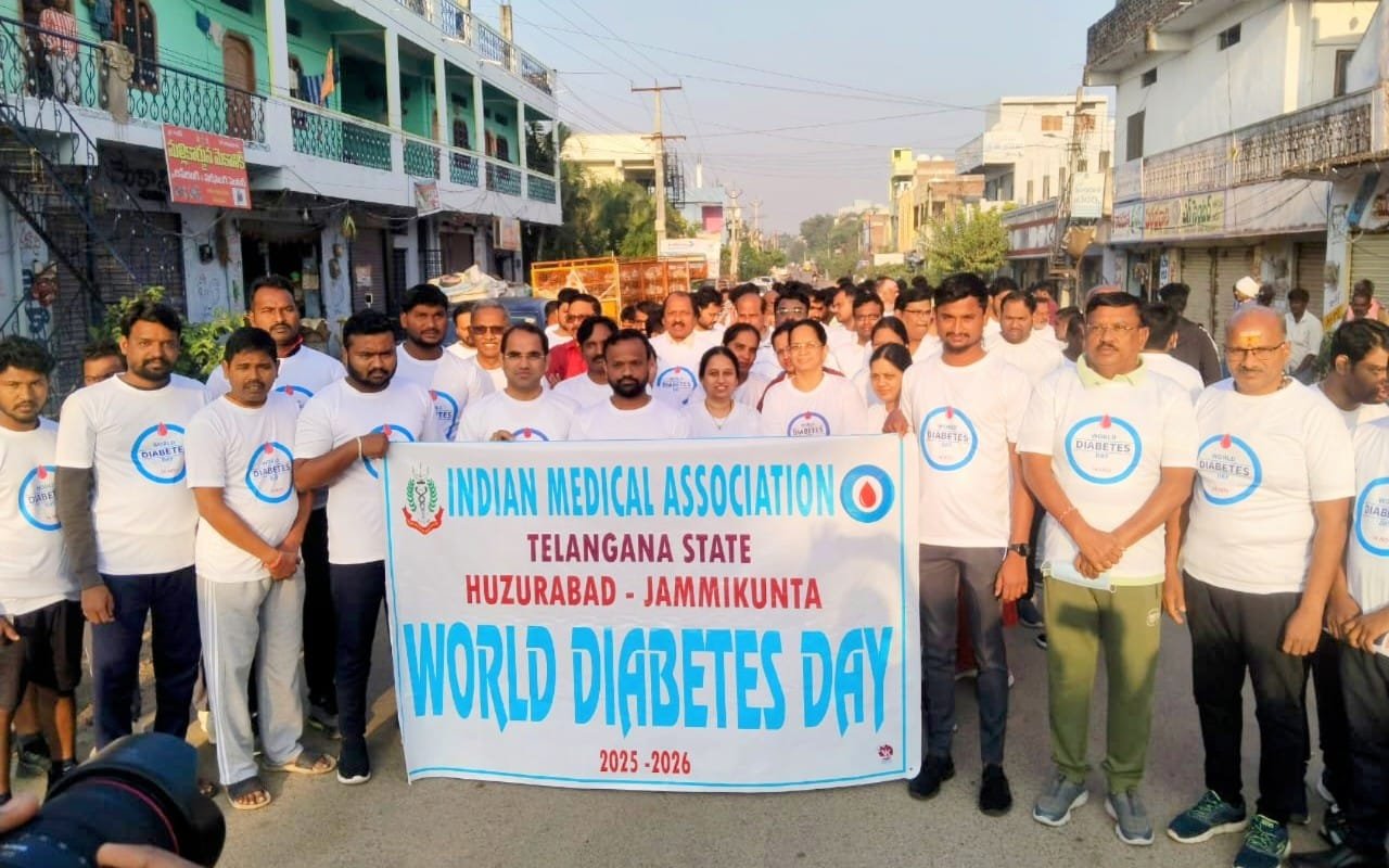 జమ్మికుంట: ప్రపంచ మధుమేహ దినోత్సవం సందర్భంగా ప్రజల్లో అవగాహన పెంచడానికి ఇండియన్ మెడికల్ అసోసియేషన్ (IMA) హుజురాబాద్, జమ్మికుంట శాఖలు సంయుక్తంగా ఒక 2K రన్ అవగాహన ర్యాలీని నిర్వహించాయి. ఈ కార్యక్రమంలో వైద్యులు, స్థానిక ప్రజలు, ఆరోగ్య కార్యకర్తలు పెద్ద సంఖ్యలో ఉత్సాహంగా పాల్గొన్నారు. జీవనశైలి మార్పులు, క్రమం తప్పకుండా వ్యాయామం ద్వారా మధుమేహాన్ని నియంత్రించవచ్చనే సందేశాన్ని ఈ ర్యాలీ ద్వారా విజయవంతంగా ప్రజల్లోకి తీసుకెళ్లారు.