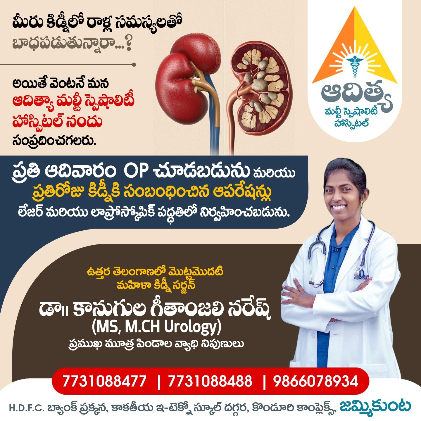 జమ్మికుంట: కిడ్నీ సంబంధిత వ్యాధులతో బాధపడుతున్న వారికి జమ్మికుంటలో మెరుగైన వైద్య సేవలు అందుబాటులోకి వచ్చాయి. ప్రముఖ కిడ్నీ స్పెషలిస్ట్ డా. గీతాంజలి నరేష్ ప్రతి ఆదివారం ఆదిత్య మల్టీ స్పెషాలిటీ హాస్పిటల్, జమ్మికుంట నందు రోగులకు అందుబాటులో ఉంటున్నారు.