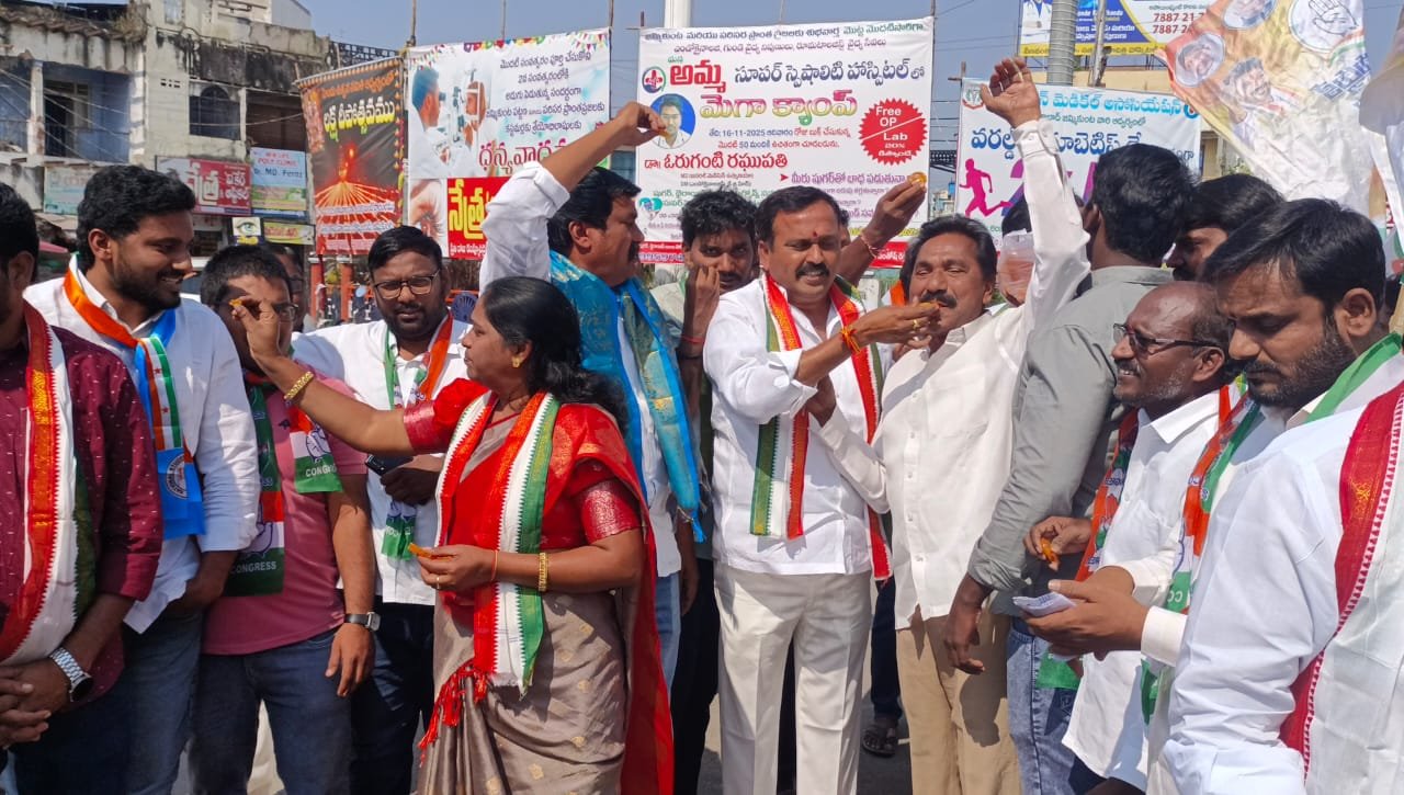 జమ్మికుంట: జూబ్లీహిల్స్లో కాంగ్రెస్ అభ్యర్థి నవీన్ యాదవ్ భారీ మెజార్టీతో గెలిచిన సందర్భంగా జమ్మికుంట గాంధీ చౌరస్తాలో కాంగ్రెస్ నాయకులు, కార్యకర్తలు సంబరాలు చేసుకున్నారు.
