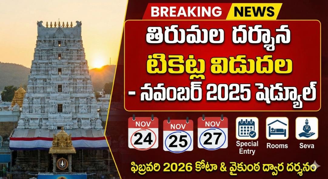 తిరుమల శ్రీవారి భక్తులకు ముఖ్య గమనిక. 2026 ఫిబ్రవరి నెలకు సంబంధించిన దర్శన టికెట్లు, గదుల కోటా మరియు వైకుంఠ ద్వార దర్శన వివరాలను టీటీడీ విడుదల చేస్తోంది. ఈ నవంబర్ నెలలో మిగిలిన ముఖ్యమైన విడుదల తేదీల పట్టిక కింద ఇవ్వబడింది.